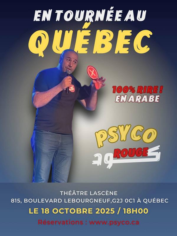 18 octobre 2025 Psyco code rouge au Théâtre Lascène, 815 Boul Lebourgneuf à Québec Navigation de l'article18 octobre 2025. Soirée Kabyle avec la chanteuse Yamina à Montréal 24 octobre 2025. Oscar Peterson Concert Hall In Memory of Ziad Rahbani