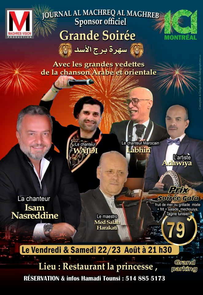Grande SOIRÉE AVEC LES CHANTEURS Isam Nasreddine, Wajdi, Labhiri, Adawiya, Med Salah Harakati au restaurant La Princesse à Montréal