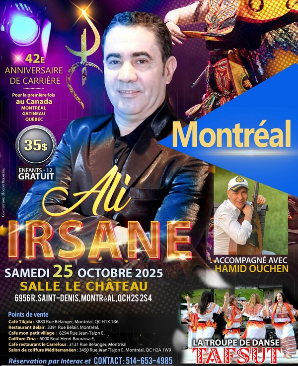 25 octobre 2025. Ali Irsane en spectacle à la Salle le Château, 6956 Saint-Denis à Montréal avec Hamid Ouchen et Tafsut Navigation de l'article24 octobre 2025. Oscar Peterson Concert Hall In Memory of Ziad Rahbani 25 octobre 2025. Le groupe Index en concert à Montréal