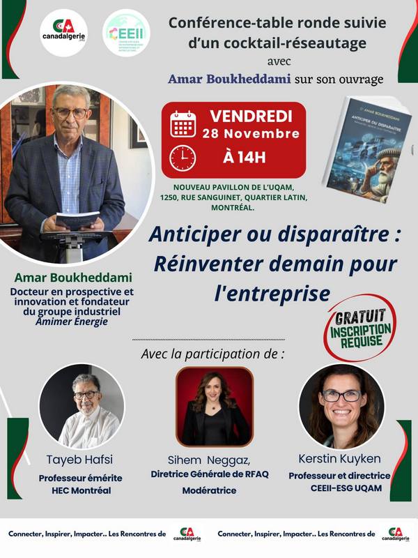 Canadalgerie.info, en partenariat académique avec le Centre d’études en entrepreneuriat international et interculturel (CEEII-UQAM), vous convie à une conférence-table ronde stratégique réunissant des experts de haut niveau.
