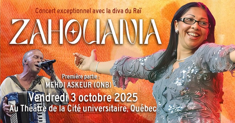 La ville de Québec aura l’immense privilège d’accueillir Cheba Zahouania, icône incontestée de la musique raï, pour un concert exceptionnel et inédit, le vendredi 3 octobre 2025 au Théâtre de la Cité universitaire.