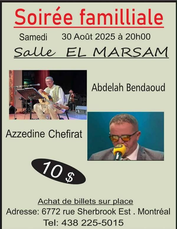 30 septembre 2025. Soirée familiale avec Azzedine Chefirat et Abdelah Bendaoud à La Salle El Marsam, 6772 rue Sherbrook Est, Montréal