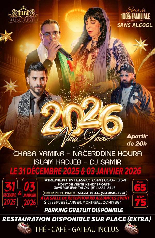 31 décembre 2025 et 3 janvier 2026. Soirée du nouvel an avec Chaba Yamina, Naceddine Houra, Islam Hadjeb et DJ Samir à la salle RB Alliance, 3895 rue Jean-Talon Est à Montréal