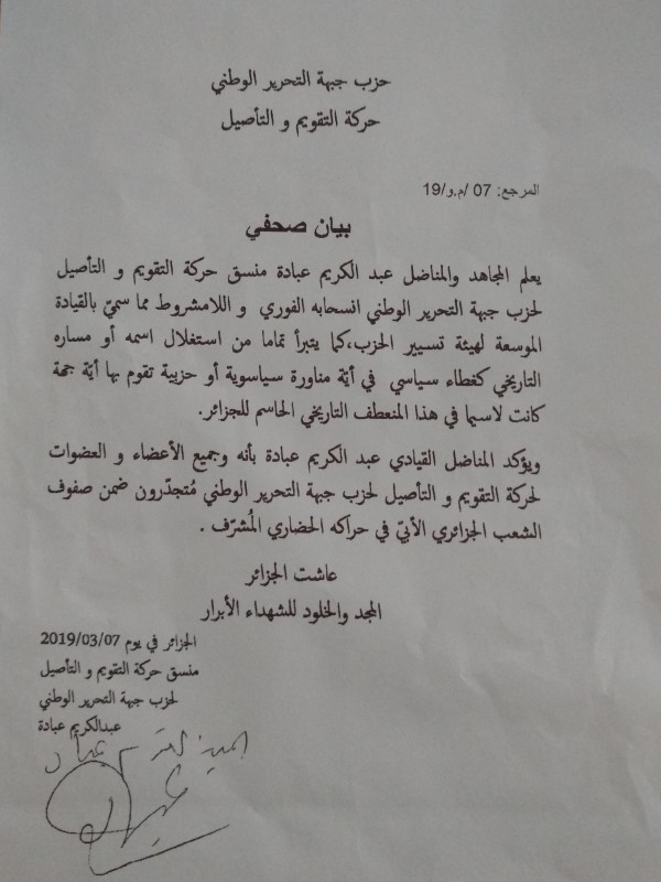 وجاء في بيان منسّق ما ظل يعرف « حركة التقويم والتأصيل للأفلان »: « أتبرأ تماما من استغلال اسمي أو مساري التاريخي كغطاء سياسي في أية مناورة سياسوية أو حزبية تقوم بها أية جهة كانت لاسيما في هذا المنعطف التاريخي الحاسم للجزائر ».