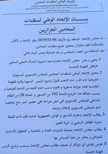 وجاء في البيان: « لغرض تفادي أي انزلاق أو تصعيد، يطالب مجلس الاتحاد بسحب ترشيح الرئيس لعهدة خامسة »، كما طالب اتحاد المحامين بـ »تأجيل الانتخابات الرئاسية » و »تأسيس مرحلة انتقالية لا تتجاوز سنة واحدة تشرف عليها حكومة محايدة ».