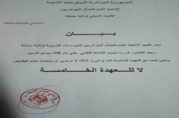 في غضون ذلك، أعلن الاتحاد الولائي لنقابات التربية بخنشلة، الخميس، « عدم التزامها بقرار عبد المجيد سيدي السعيد، دعم ترشح بوتفليقة لفترة رئاسية جديدة ».