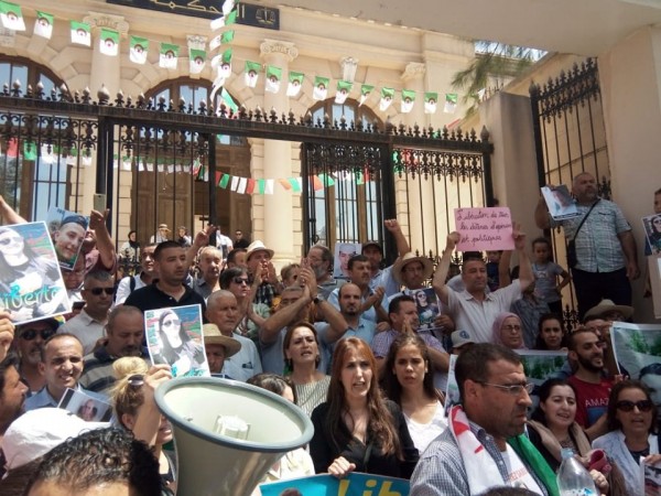 كما تجمع المتظاهرون أمام مقر المحكمة، رافعين شعارات منددة بالمتابعات القضائية ضد المتظاهرين والنشطاء في الحراك الشعبي الذي بدأ في 22 فيفري الماضي وتواصل لمدة أربعة أشهر في أجواء سلمية.