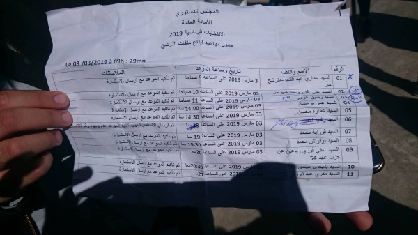 وشهدت القائمة، تواجد اسم المترشح الحر « رشيد نكّاز » المبرمج على الثالثة من بعد زوال اليوم، وسط إشارة إلى عدم قيام نكاز بتأكيد الموعد، مع إرساله الاستمارة، بينما تسود الضبابية موقف رئيس الحكومة السابق « علي بن فليس » الذي سيكون له لقاء صحفي بعد زوال اليوم.