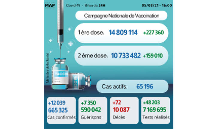 Le nouveau bilan porte à 665.325 le nombre total des contaminations depuis le premier cas signalé au Maroc en mars 2020. Le nombre des personnes rétablies est passé à 590.042, soit un taux de guérison de 88,7%.