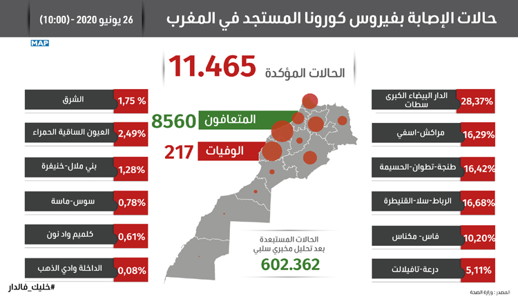 Cent-vingt-sept (127) nouveaux cas d’infection au nouveau coronavirus (Covid-19) ont été confirmés au Maroc jusqu’à vendredi à 10h00, portant à 11.465 le nombre total des cas de contamination, a annoncé le ministère de la Santé.