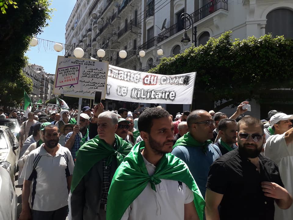 13h45 à la rue Didouche. Des manifestants, munis de drapeaux algérien et palestinien ainsi qu’ d’un portrait de Taleb Ibrahimi, scande « Ya ouled frança dégage (agents de la France, dégagez !) ». Un peu plus bas, une foule nombreuse et variée crie en marchant : « pouvoir assassin », « fraternité entre le peuple et l’armée, Gaïd est avec les traitres ». Les manifestants semblaient en colère contre le chef d’état-major de l’armée qu’ils soupçonnent de nourrir des projets pour instaurer un régime militaire en Algérie.