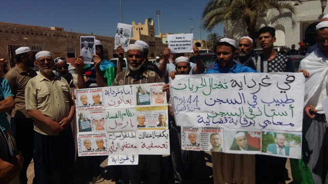 Sit-in à Ghardaia en soutien aux détenus mozabites. Photo : Djamel K.Une centaine de Mozabites ont organisé, mardi à partir de 10h30, un rassemblement de soutien aux détenus mozabites, en l’occurrence le Dr Kamel Eddine Fekhar, Hadj Brahim Aouf, Ahmed Lassakeur, Nordine Tichabet, Idriss Kheyat et Mohamed Baba Nedjar.