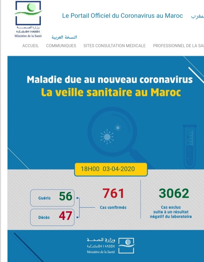 Le bilan s’alourdit. Le ministère de la Santé annonce ce vendredi à 18H une augmentation de 70 nouveaux cas en 24 heures, portant le nombre total des cas positifs à 761. En ce qui concerne les guérisons, le nombre total a atteint ce jeudi 56, soit 26 nouveaux guéris. Quant au nombre de décès, il a atteint 47.