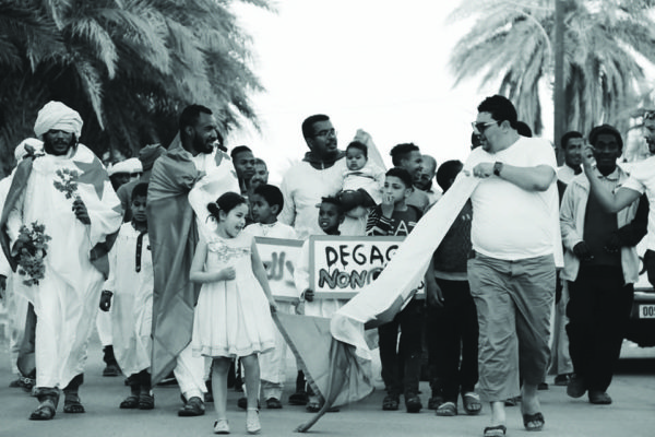 A la place Somoud, des jeunes commencent à se regrouper en fin d’après-midi pour la marche désormais hebdomadaire depuis le 22 fevrier dernier. A cause de la chaleur, les habitants préfèrent décaler la sortie pour éviter le soleil tapant et permettre aux familles de s’y rendre. Il n’y a pas foule, une soixantaine de manifestants se regroupent petit à petit sur les lieux et c’est donc à partir de 17h que le rassemblement prend enfin son élan banderoles en main, drapeaux hissés avec en tête du peloton la petite Tasnim, accompagnée de son père criant : «Djazaïr horra dimocratiya !».