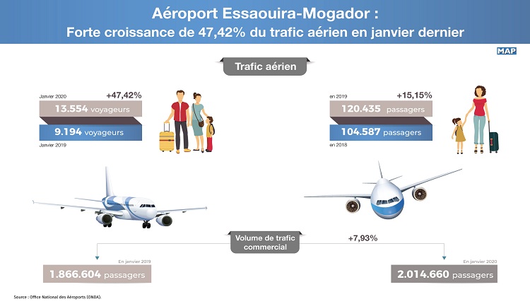 Essaouira – Le trafic aérien des passagers au niveau de l’aéroport international d’Essaouira-Mogador a réalisé une forte croissance de 47,42% en janvier dernier par rapport à la même période de l’année écoulée, selon les données mensuelles publiées par l’Office National des Aéroports (ONDA).