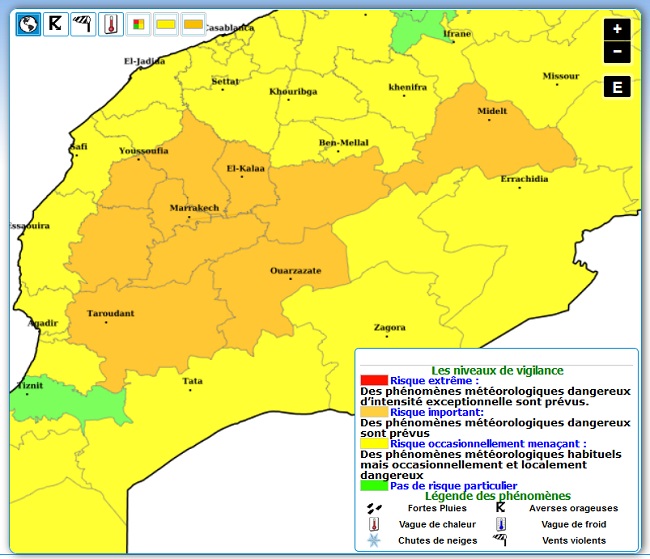 La carte interactive disponible sur la plateforme de la DMN « vigilance.marocmeteo.ma » annonce un risque important et des phénomènes météorologiques dangereux prévus dans les régions d’Al Haouz, Azilal, Chichaoua, El Kelaa des Sraghna, Marrakech, Midelt, Ouarzazate, Rehamna, Taroudant, Youssoufia.