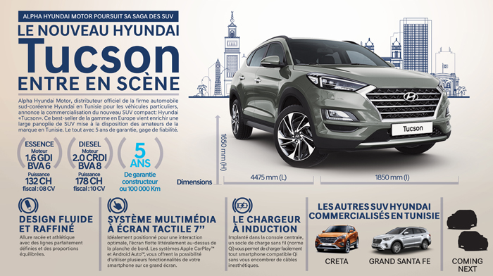 Alpha Hyundai Motor, distributeur officiel de la firme automobile sud-coréenne Hyundai en Tunisie pour les véhicules particuliers, annonce la commercialisation du nouveau SUV compact :« Hyundai Tucson ». Ce best-seller de la gamme en Europe vient enrichir une large panoplie de SUV mis à la disposition des amateurs de la marque en Tunisie.