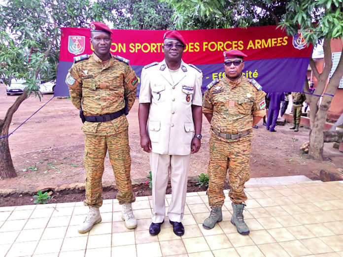C’est main dans la main que le chef d’état-major des armées, le général de brigade, Moïse Miningou (centre), le PCE entrant (gauche) et le PCE sortant ont promis relever les défis qui se présententL’Union sportive des forces armées (USFA) a tenu le jeudi 27 août à Ouagadougou, son assemblée générale ordinaire. Les militaires, avec le lieutenant-colonel Hamed Rouamba aux commandes, ont réaffirmé leur intention de retrouver ses couleurs avec des titres nationaux dans tous les sports.