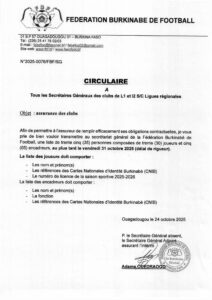 Dans sa politique d’assurer les principaux acteurs du football burkinabè, la Fédération burkinabè de football (FBF) a contracté une assurance pour les clubs de D1 et D2 du championnat national au titre de la saison 2025-2026. Selon le secrétaire général de la FBF, Boureima Balima, pour cette saison, 16 clubs de la D1 et 24 clubs de la D2 sont assurés par la Fédération. « Il s’agit de 30 joueurs et des 5 membres du staff par équipe », précise-