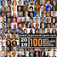 La liste 2019 des 100 personnes les plus crédibles dans le monde comprend des personnalités de renom issues de divers secteurs tels que le divertissement, la politique, la religion, l’éducation, la philanthropie, les affaires, etc. Ayant rassemblé des croisements dans plus de 44 pays à travers le monde, la portée du sondage sur la réputation s’étend chaque jour davantage.