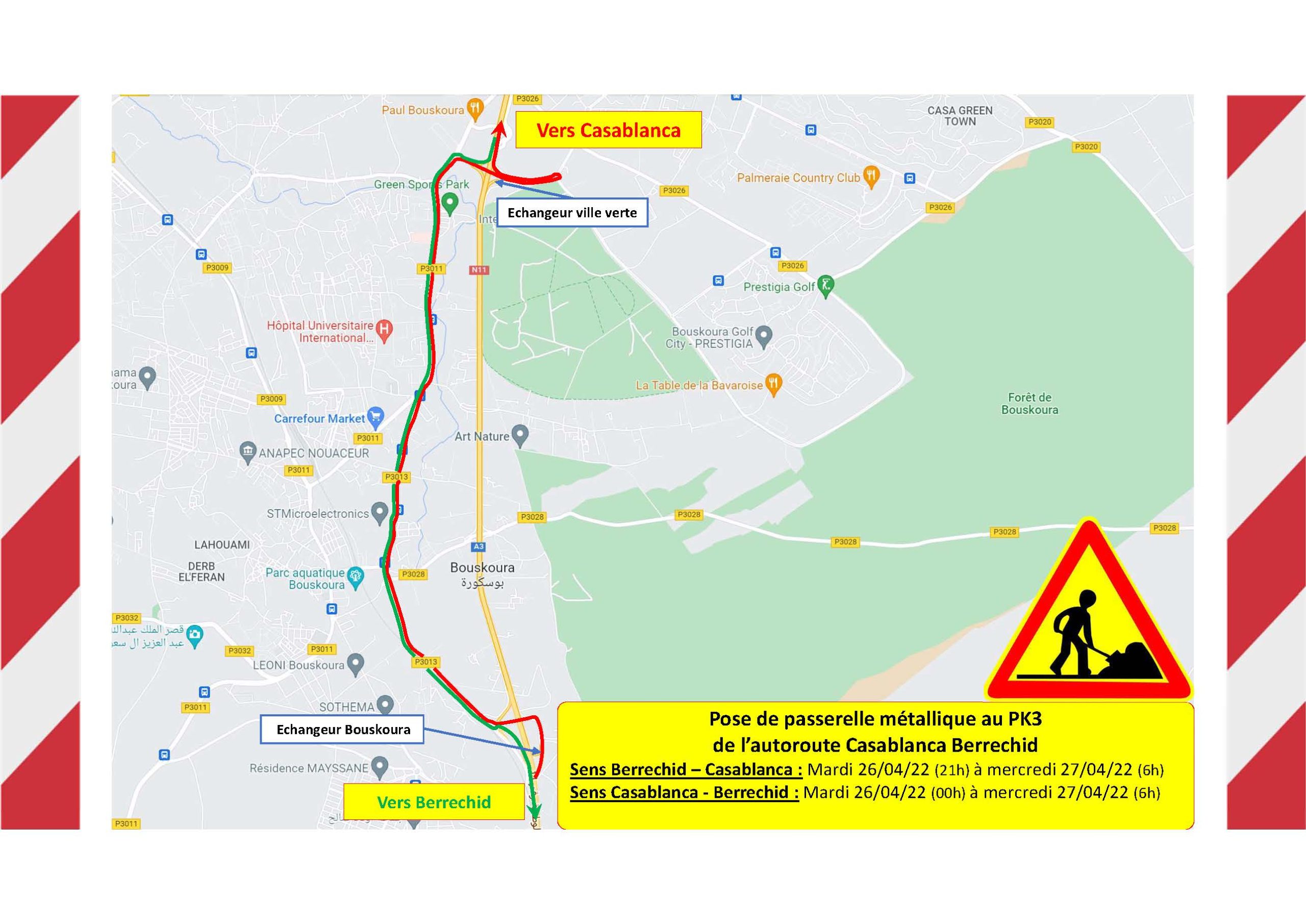 « Dans le cadre des travaux d’élargissement à 2×3 voies de l’autoroute Casablanca-Berrechid, ADM informe les usagers de l’autoroute Casablanca-Berrechid qu’une passerelle piétons sera posée au niveau du point kilométrique PK3 (entre l’échangeur de la ville verte et l’échangeur de Bouskoura) pendant la nuit du mardi 26/04/2022 à 21h00 jusqu’au mercredi 27/04/2022 à 6h00 », indique ADM dans un communiqué.
