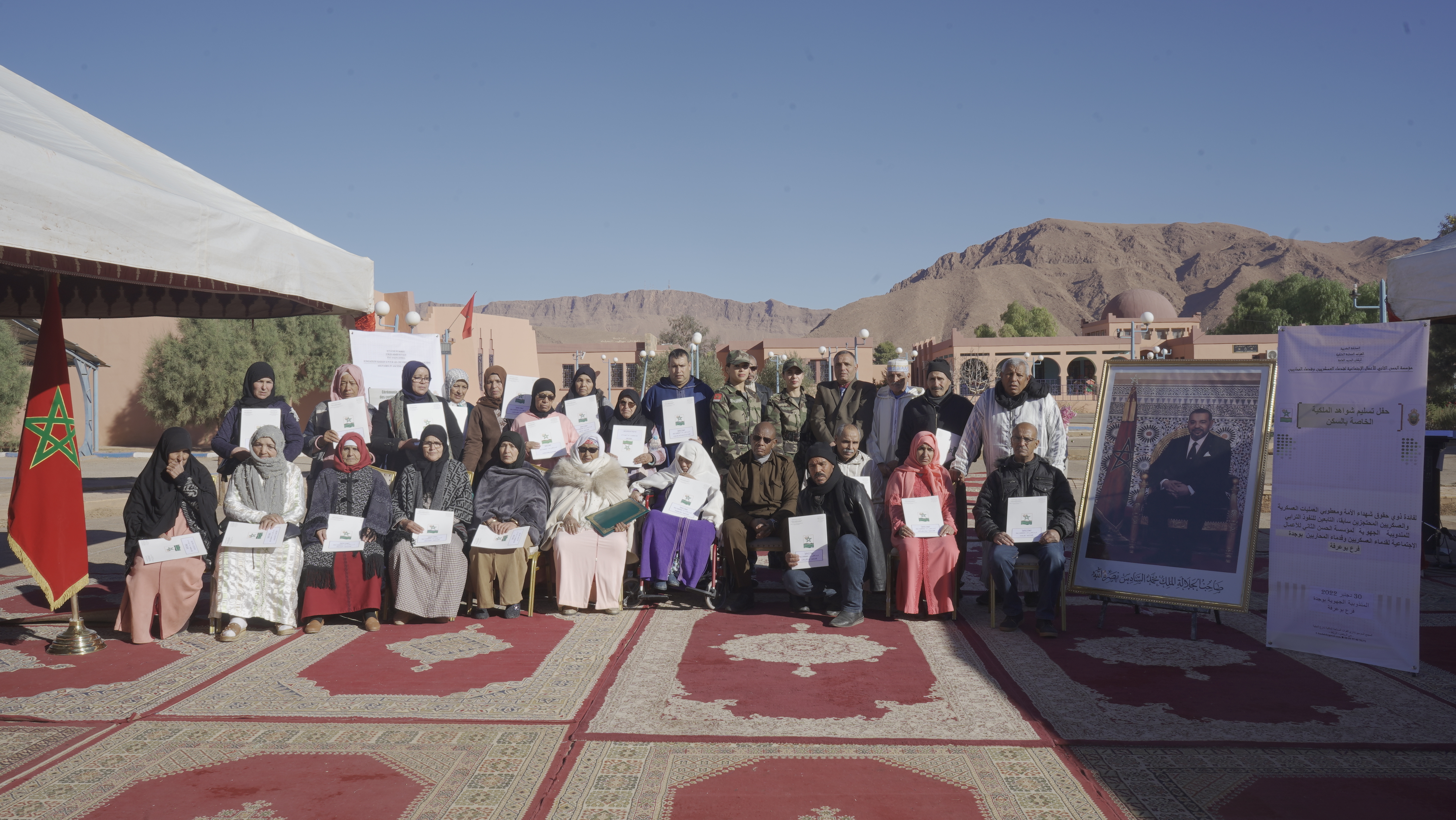 Supervisée au niveau de la Place d’armes de Bouarfa-Figuig par la délégation régionale de la Fondation Hassan II pour les œuvres sociales des anciens militaires et anciens combattants (OSAMAC) d’Oujda (Antenne sociale de Bouarfa), cette opération a été marquée par la remise des certificats de propriété de logements au profit de 83 ayants-droits des martyrs, des blessés de guerre et des rapatriés au niveau de Bouarfa et de Taourirt, et ce lors d’une cérémonie tenue en présence de responsables militaires et de représentants d’institutions civiles.