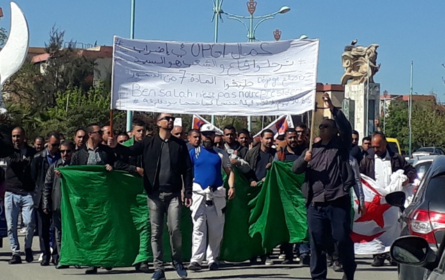 Marche à Bouira. Photo Amar F. El WatanLa mobilisation ne faiblit pas à Bouira. Ce lundi, ce sont les travailleurs de la Société de distribution de l’électricité et du gaz du centre (SDC) et ceux de l’Office de promotion et de gestion immobilière (Opgi), en grève depuis plusieurs semaines, qui ont organisé une marche pour appeler au départ du gouvernement et de tous les symboles du système.