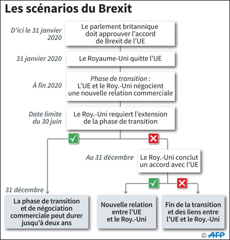 ■ Le défi du temps: Boris Johnson assure qu’il conclura un nouvel accord commercial avec l’UE d’ici la fin de la période de transition qui suivra le Brexit (d’ici le 31 décembre 2020). Et il ne demandera pas de temps supplémentaire à Bruxelles. «La conclusion d’un accord commercial fin 2020, c’est extrêmement ambitieux. Mais ce ne sera pas réalisé si nous n’essayons pas…», a souligné le Premier ministre irlandais Leo Varadkar. Le gouvernement britannique a jusqu’au 1er juillet pour demander un report de la période de transition au-delà de fin 2020. A cette date, il ne pourra présenter qu’une demande unique pour un ou deux ans supplémentaires.