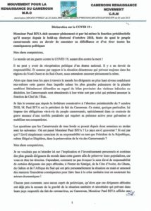 Le leader du Mouvement pour la renaissance du Cameroun (MRC), second à la présidentielle de 2018, est l’auteur d’une déclaration incendiaire contre le pouvoir de Yaoundé, en particulier son chef, publiée le 27 mars 2020. Pour Maurice Kamto, le chef de l’Etat ne donne pas l’impression d’être inquiet de la santé des camerounais. Il juge insignifiante les mesures gouvernementales prises, et annonce un plan de collecte des fonds dans le pays et l’étranger pour mettre les citoyens à l’abri du Coronavirus.
