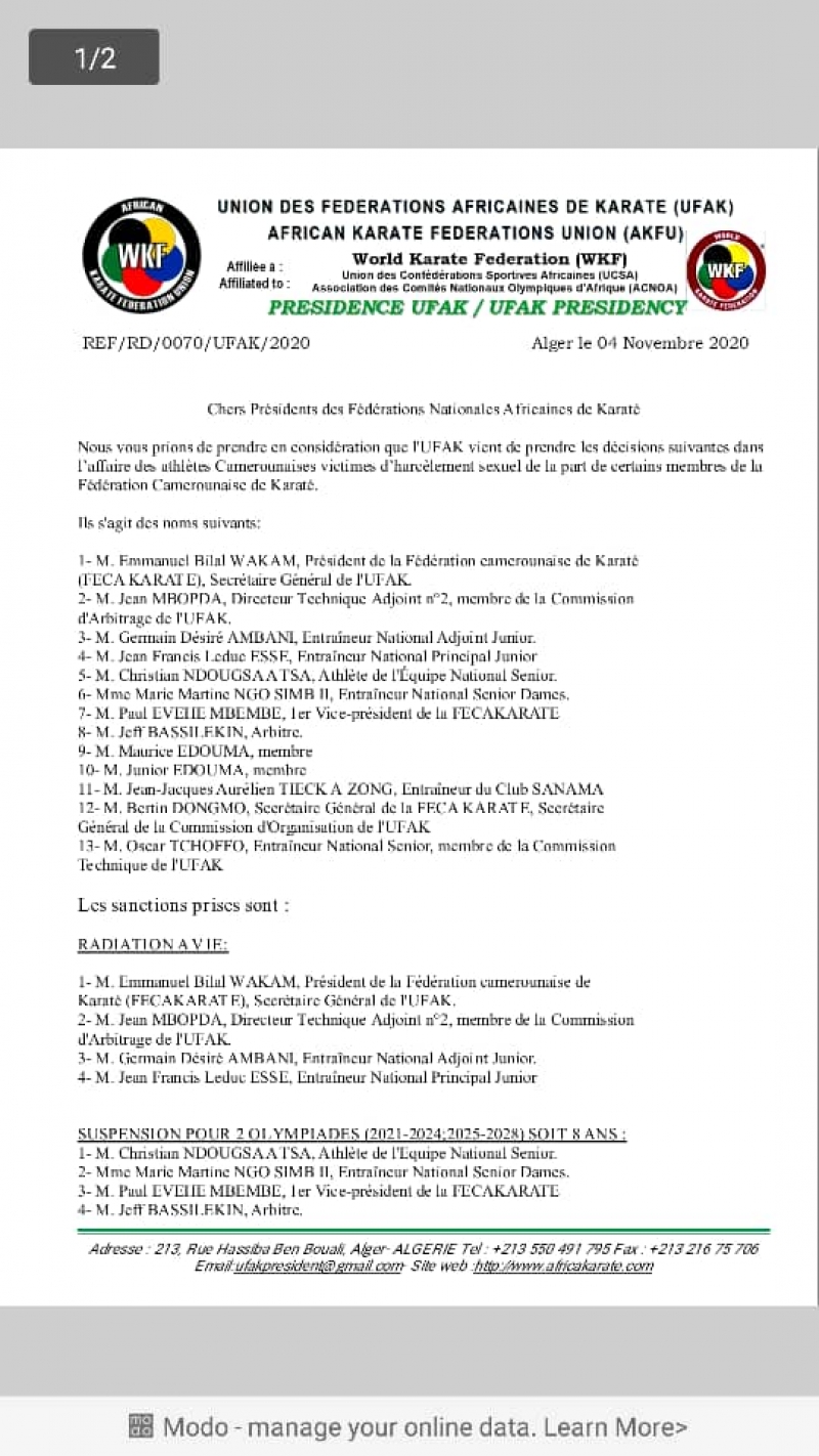 L’ancien président de la Fédération Camerounaise de Karaté, et secrétaire général de l’UFAK Emmanuel Wakam, suspendu pour 8 ans par le Comité national et sportif sportive, dans l’affaire de harcèlement sexuel des jeunes athlètes, écope d’une radiation à vie du karaté par l’instance faitière continentale. Ainsi que trois de ses anciens collaborateurs. Une catégorie d’entre eux reçoit des suspensions pour deux olympiades et une autre des blâmes.