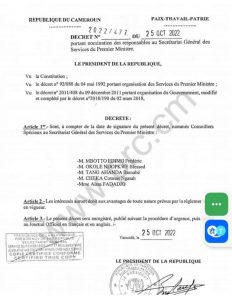 Ce sont quatre hommes et une femme. Ils sont nommés par décret N°2022/477 du 25 octobre 2022. L’acte présidentiel en question porte nomination des responsables au secrétariat général des services du Premier ministre. Ledit décret a fait l’objet de lecture au journal 17-18 sur le Poste national de la CRTV ce 25 octobre 2022. Ci-dessous le décret présidentiel du 25 octobre 2022.