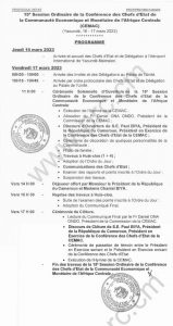 Ci-dessous, le programme officiel de la 15è session ordinaire de la Conférence des chefs d’Etat de la Communauté économique et monétaire de l’Afrique centrale (Cemac) des 16 et 17 mars 2023 au Palais de l’Unité.