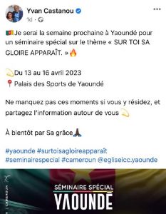 Pour plusieurs chrétiens, s’appuyant sur Romain 8 : 19, c’est peut-être l’heure de la révélation des fils et filles de Dieu que le monde et singulièrement le Cameroun ont longtemps attendu. Est-ce donc la gloire de Dieu qui veut apparaître sur le Cameroun ? C’est en tout cas ce que propose l’église Impact Centre Chrétien (ICC), dont la branche de Yaoundé organise un séminaire du 13 au 16 avril 2023 au Palais polyvalent des sports de Yaoundé avec son père fondateur, l’apôtre Yvan Castanou.
