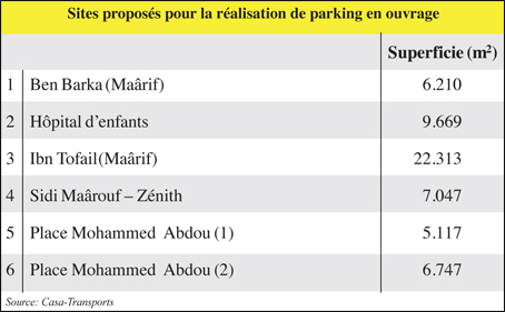 Le choix des décideurs a porté sur 6 sites suite à une étude préliminaire sur les prévisions de la demande (réalisée par le bureau d’études Transitec). Il s’agit du fameux parking au centre du quartier commercial du Maârif (place Ben Barka), dont la superficie s’élève à plus de 6.200 m2. Le site abrite actuellement un parking en surface, exploité jusqu’ici par Casadev (il relève dorénavant de Casa-Transports qui a hérité des dossiers de cette SDL dissoute).