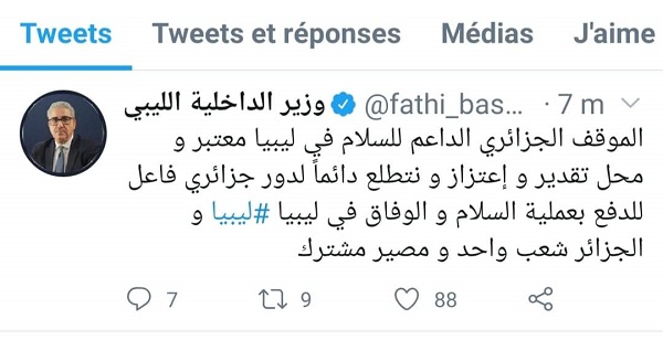 « La position de l’Algérie en faveur de la paix en Libye est considérable et nous nous réjouissons toujours du rôle de l’Algérie pour redynamiser le processus de paix en Libye », a affirmé M. Bashagha sur son compte twitter, ajoutant que « la Libye et l’Algérie sont un seul peuple au destin commun ».