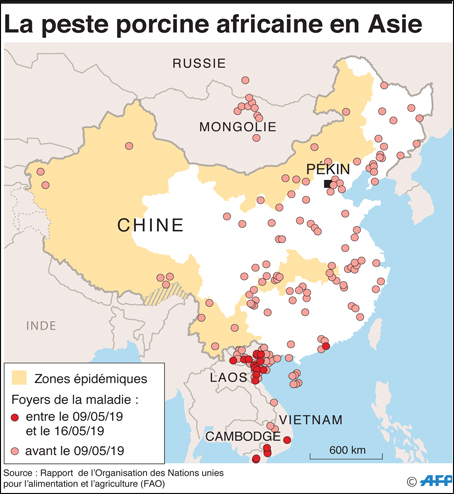 Début 2019, vingt provinces chinoises sont touchées par la peste porcine et un million de bêtes ont été abattues et retirées de la consommation. Les dernières apparitions de la maladie déclarées par la Chine se rapprochent de la frontière du Laos au sud du pays. L’épidémie a également atteint le Vietnam, le Cambodge et la Mongolie