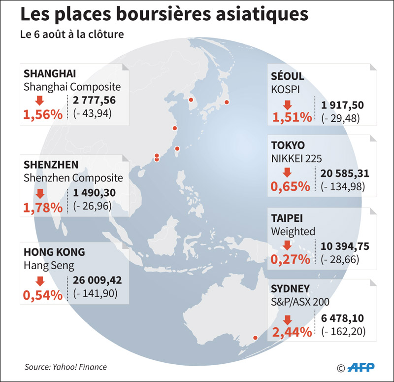 Dans la foulée de la débâcle à Wall Street la veille, les Bourses asiatiques ont encore souffert mardi 6 août des vives tensions commerciales entre Washington et Pékin. Elles sont doublées désormais de passes d’armes sur la monnaie chinoise