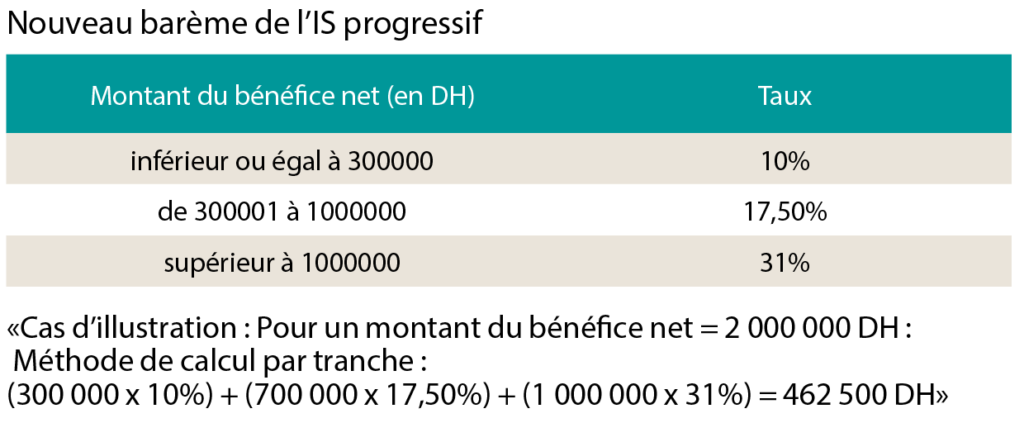 La Loi de finances 2010, a poursuivi le processus de l’allègement du poids de l’IS entamé en 2018. La progressivité instaurée au profit des sociétés et notamment des PME vise, selon la circulaire, à adapter cet impôt à leurs « spécificités » pour assurer l’équité fiscale. Le nouveau barème de l’IS a fait baisser le taux intermédiaire de 20% à 17,5% pour la tranche de bénéfice allant de 300.001 dhs à 1.000.000 dhs. Le taux spécifique de 17,5 % appliqué à certaines sociétés opérant dans les secteurs de l’éducation, du tourisme, des mines, du sport, de l’Agriculture … ou de la formation professionnelle n’est plus le seul applicable auxdites sociétés. Désormais, la progressivité remplace le traitement uniforme des bénéfices. Un taux de 10% sera appliqué au bénéfice inférieur ou égal à 300 000 dirhams. Tout montant supérieur à ce premier seuil sera imposé au taux de 17,5% quel que soit le montant du bénéfice réalisé.
