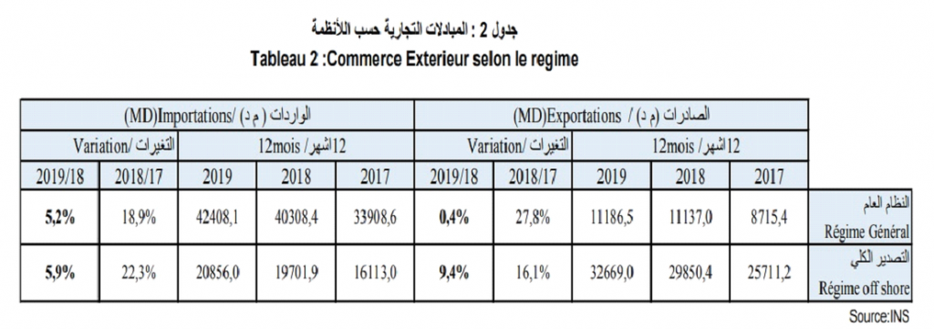 Revenons aux chiffres : La répartition des échanges par régime montre une hausse des exportations sous le régime offshore de 9,4% contre +16,1% durant l’année 2018. Sous le même régime, les importations augmentent de 5,9% contre +22,3% durant l’année 2018. Sous le régime général, ce qui est très important, les exportations sont en légère hausse de 0,4% contre +27,8% durant l’année 2018. De même, les importations augmentent de 5,2% contre +18,9% durant l’année 2018.