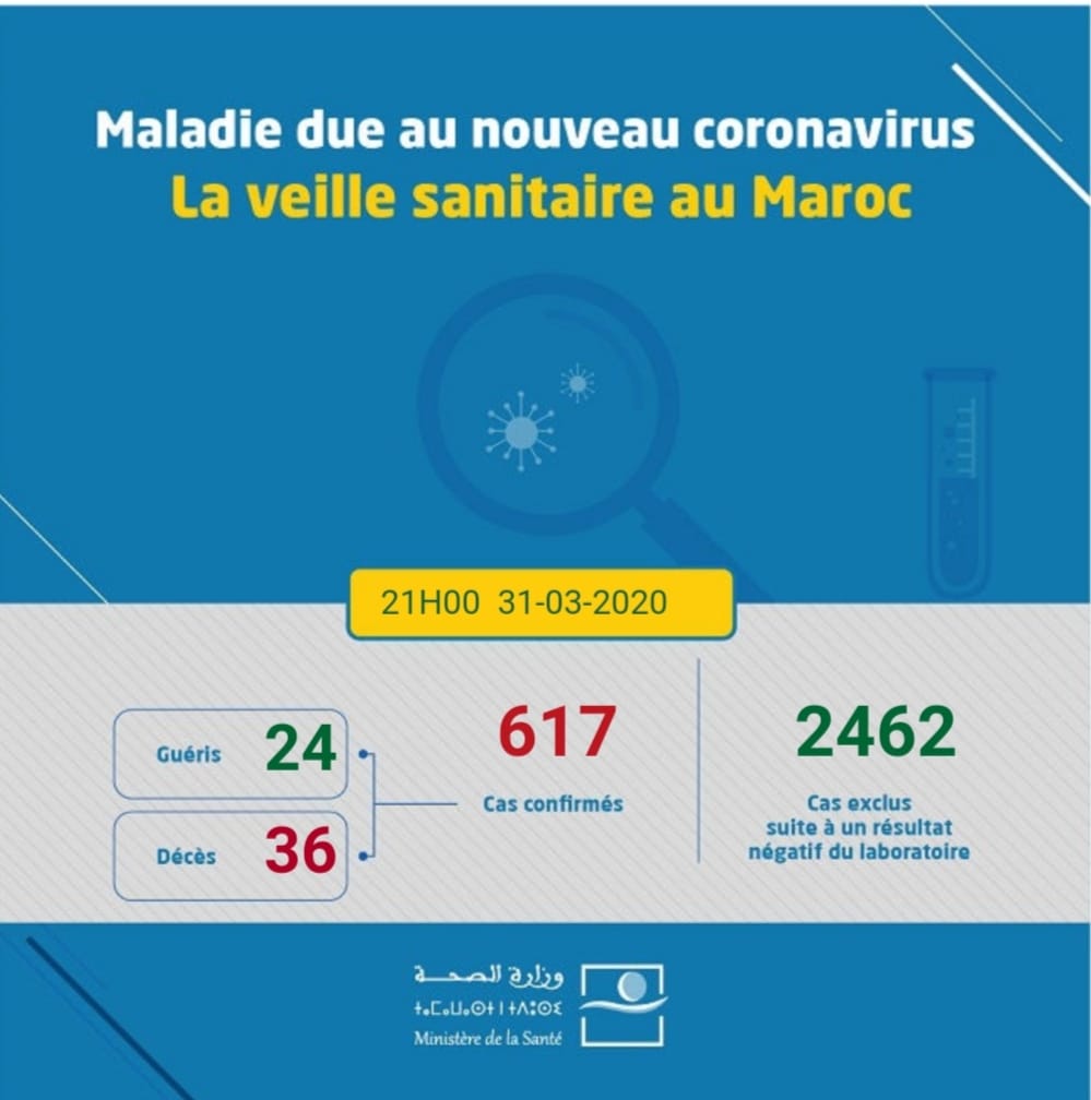 15 nouveaux cas d’infection au nouveau coronavirus ont été confirmés au Maroc dans les dernières 3 heures, portant à 617 le nombre total de cas de contamination, a annoncé le ministère de la Santé.