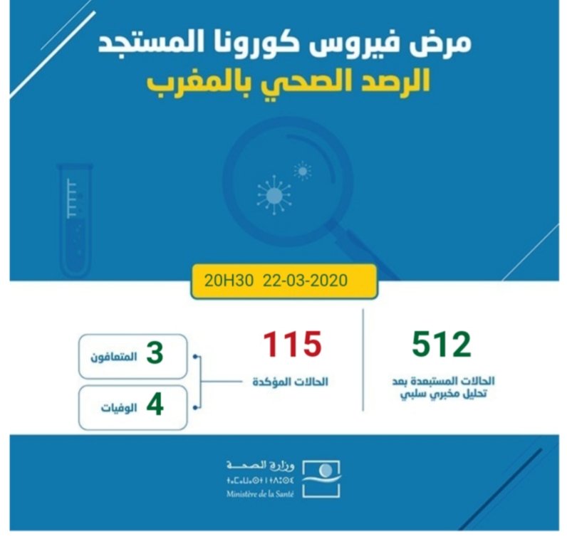 Le 4ème décès et 6 nouveaux cas confirmés de contamination au nouveau coronavirus (Covid-19) ont été enregistrés au Maroc, portant à 115 le nombre total d’infections dans le Royaume jusqu’à dimanche soir, annonce le ministère de la Santé sur son site « www.covidmaroc.ma ».