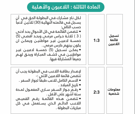 Pour les joueurs étrangers, le nom du joueur doit figurer dans la liste des équipes locales et dans la liste du championnat arabe, et le contrat signé entre le joueur et le club n’est pas acceptable pendant une période de 6 mois en cas de prêt ou au moins une saison sportive complète en cas de transfert définitif.