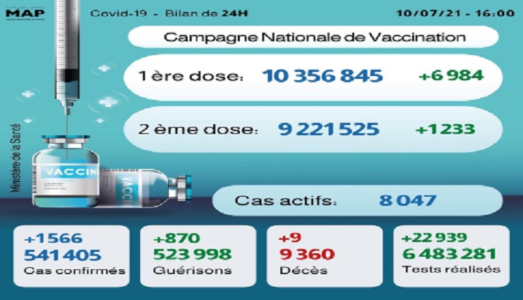 Le nombre de primo-vaccinés est de 10.356.845, alors que celui des personnes complètement vaccinées (1ère et 2ème doses) s’élève à 9.221.525, a précisé le ministère dans son bulletin quotidien sur la situation de la Covid-19.