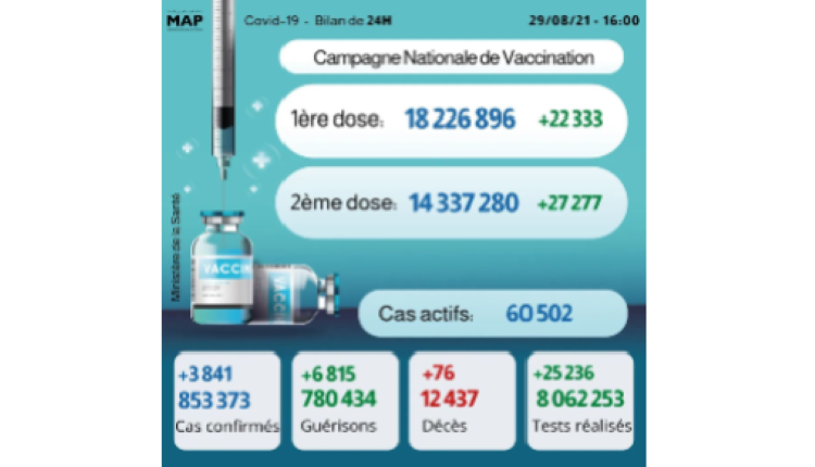 Le nouveau bilan porte à 853.373 le nombre total des contaminations depuis le premier cas signalé au Maroc en mars 2020. Le nombre des personnes rétablies est passé à 780.434 soit un taux de guérison de 91,5%.