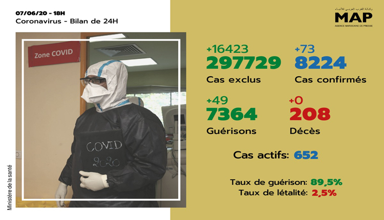Ce nouveau bilan porte à 8.224 le nombre de contaminations dans le Royaume depuis la déclaration du premier cas le 2 mars dernier et à 7.364 le nombre des personnes totalement rétablies, a précisé Dr Mouad Mrabet, coordonnateur du Centre national des opérations d’urgence de santé publique au ministère de la santé, dans une déclaration retransmise par la MAP sur sa chaîne de télévision M24 et sur RIM RADIO.
