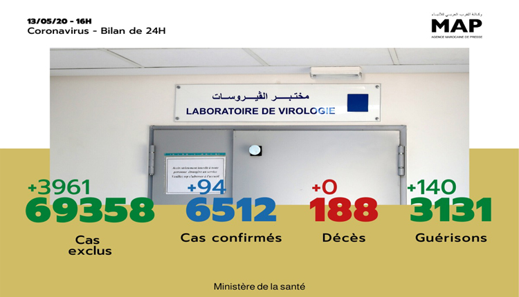 Quatre-vingt-quatorze (94) nouveaux cas d’infection au COVID-19 ont été enregistrés durant les dernières 24 heures, portant le nombre total des cas de contaminations à 6.512 dans le Royaume, a annoncé mercredi le ministère de la Santé.