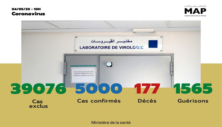 Quatre-vingt-dix-sept (97) cas supplémentaires d’infection au nouveau coronavirus (Covid-19) ont été confirmés au Maroc jusqu’à lundi à 10h00, portant à 5.000 le nombre total des cas de contamination, annonce le ministère de la Santé.