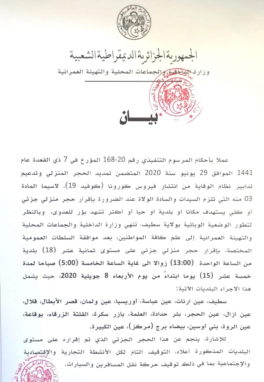 Décrétée au vu de l’évolution de la situation épidémiologique à Sétif, cette mesure intervient « en application des dispositions du décret exécutif 20-168 du 29 juin 2020 portant prorogation du confinement partiel à domicile et renforcement du dispositif de lutte contre l’expansion du