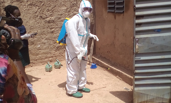 La Commission de prévention et contrôle des infections intervient dans la lutte contre la pandémie au Burkina, à travers la désinfection des domiciles et des services des cas suspects ou confirmés du COVID-19. Elle veille aussi au respect du protocole des enterrements dignes et sécurisés des dépouilles de COVID-19 et assure la bonne gestion des déchets issus de la maladie, selon les explications de Kamboulbé Dah, membre de la commission. C’est dans l’accomplissement de ses missions que celle-ci a effectué une opération de désinfection du domicile d’une patiente, le jeudi 7 mai 2020 à Taabtinga, un quartier périphérique de Ouagadougou.
