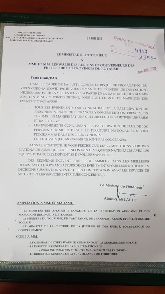 Le ministère de l’Intérieur joue la carte de la précaution. Dans une circulaire datée du 4 mars 2020, Abdelouafi Laftit, ministre de l’intérieur, exhorte les walis et gouverneurs d’interdire, durant tout le mois de mars, plusieurs évènements. Objectif : lutter contre le risque de propagation du coronavirus.